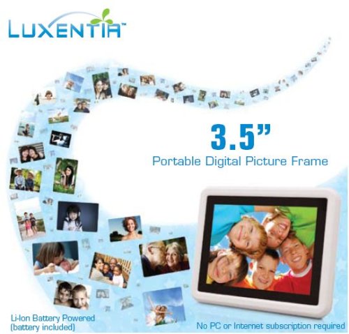 A perfect gift for any occassion, the portable and easy to use Luxentia 3.5" Digital Picture Viewers allows you to take your favorite photos on the go. The Luxentia 3.5� Digital Photo Viewer features a vibrant 320x240 digital screen, a Li-Ion battery, 128MB of internal memory (holds approx 1000 photos) and a PlugNPlay SD/MMC media card reader with USB Host support. It comes in an elegant white frame with a protective pouch for on-the-go use, and a built-in backstand for desktop/countertop display.