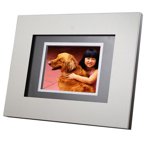 The digital frame is equipped with an intuitive user interface, with sophisticated on-frame firmware that supports a variety of functions, including multi-resolution zoom, photo rotation, and varying slideshow transition speeds and effects. The clean interface also makes it a breeze to browse your various photo files, as does the ultra-thin, battery-powered remote control. Other details include on-frame speakers for your MP3 tunes, a 5.6-inch diagonal TFT active matrix LCD display with a 320 x 234 resolution, and an attractive brushed gold housing that adds a contemporary touch to any room in the house.