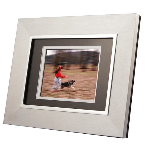 The digital frame is equipped with an intuitive user interface, with sophisticated on-frame firmware that supports a variety of functions, including multi-resolution zoom, photo rotation, and varying slideshow transition speeds and effects. The clean interface also makes it a breeze to browse your various photo files, as does the ultra-thin, battery-powered remote control. Other details include on-frame speakers for your MP3 tunes, a 5.6-inch diagonal TFT active matrix LCD display with a 320 x 234 resolution, and an attractive brushed silver housing with a polished silver bezel that adds a contemporary touch to any room in the house.