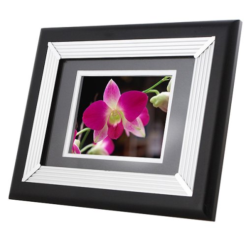 The digital frame is equipped with an intuitive user interface, with sophisticated on-frame firmware that supports a variety of functions, including multi-resolution zoom, photo rotation, and varying slideshow transition speeds and effects. The clean interface also makes it a breeze to browse your various photo files, as does the ultra-thin, battery-powered remote control. Other details include on-frame speakers for your MP3 tunes, a 5.6-inch diagonal TFT active matrix LCD display with a 320 x 234 resolution, and an attractive black housing with a silver bezel that adds a contemporary touch to any room in the house.